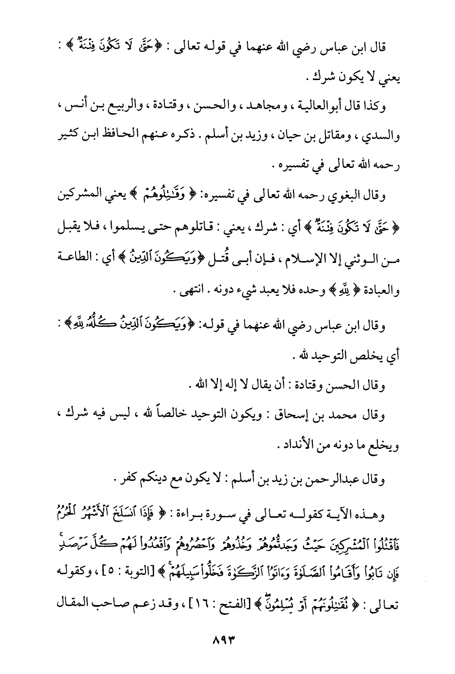 قال ابن عباس -رضي الله عنهما- في قوله تعالى: {حَتَّى لَا تَكُونَ فِتْنَةٌ}: يعني لا يكون شرك.
