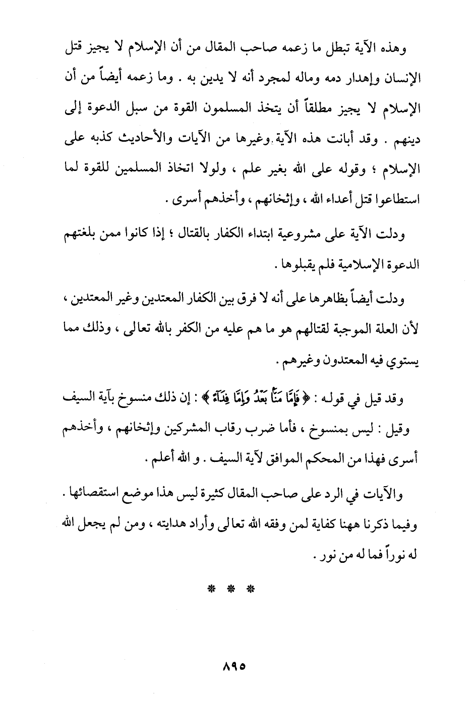 وهذه الآية تبطل ما زعمه صاحب المقال من أن الإسلام لا يجيز قتل الإنسان وإهدار دمه وماله لمجرد أنه لا يدين به، وما زعمه أيضًا من أن الإسلام لا يجيز مطلقا أن يتخذ المسلمون القوة من سبل الدعوة إلى دينهم، وقد أبانت هذه الآية وغيرها من الآيات والأحاديث كذبه على الإسلام، وقوله على الله بغير علم، ولولا اتخاذ المسلمين للقوة لما استطاعوا قتل أعداء الله، وإثخانهم، وأخذهم أسرى.