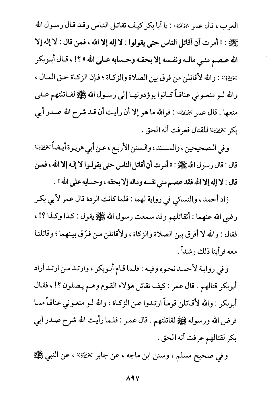 وفي رواية لأحمد نحوه وفيه: فلما قام أبو بكر، وارتد من ارتد، أراد أبو بكر قتالهم، قال عمر: كيف تقاتل هؤلاء القوم وهم يصلون؟ فقال أبو بكر: والله لأقاتلن قومًا ارتدوا عن الزكاة، والله لو منعوني عناقًا مما فرض الله ورسوله - صلى الله عليه وسلم - لقاتلتهم، قال عمر: فلما رأيت الله شرح صدر أبي بكر لقتالهم عرفت أنه الحق.