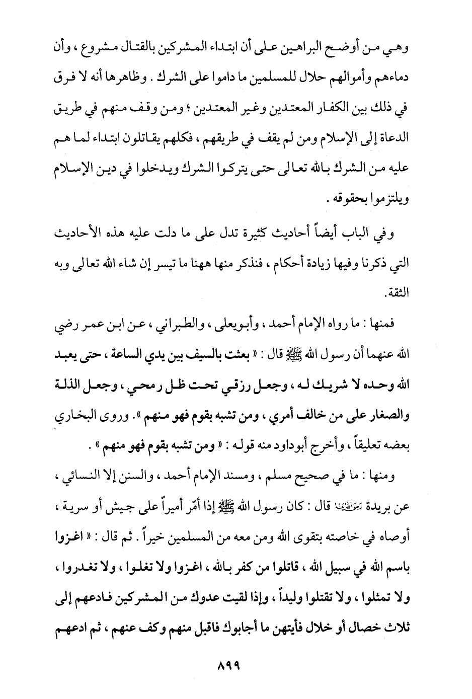 ومنها: ما في صحيح مسلم، ومسند الإمام أحمد، والسنن إلا النسائي، عن بريدة - رضي الله عنه - قال: كان رسول الله - صلى الله عليه وسلم - إذا أمّر أميرًا على جيش أو سرية، أوصاه في خاصيته بتقوى الله ومن معه من المسلمين خيرًا، ثم قال: «اغزوا باسم الله في سبيل الله، قاتلوا من كفر بالله، اغزوا ولا تَغُلّوا، ولا تغدروا، ولا تُمثّلوا، ولا تقتلوا وليدًا، وإذا لقيت عدوك من المشركين فادعهم إلى ثلاث خصال أو خلال، فأيتهن ما أجابوك فاقبل منهم وكف عنهم، ثم ادعهم
