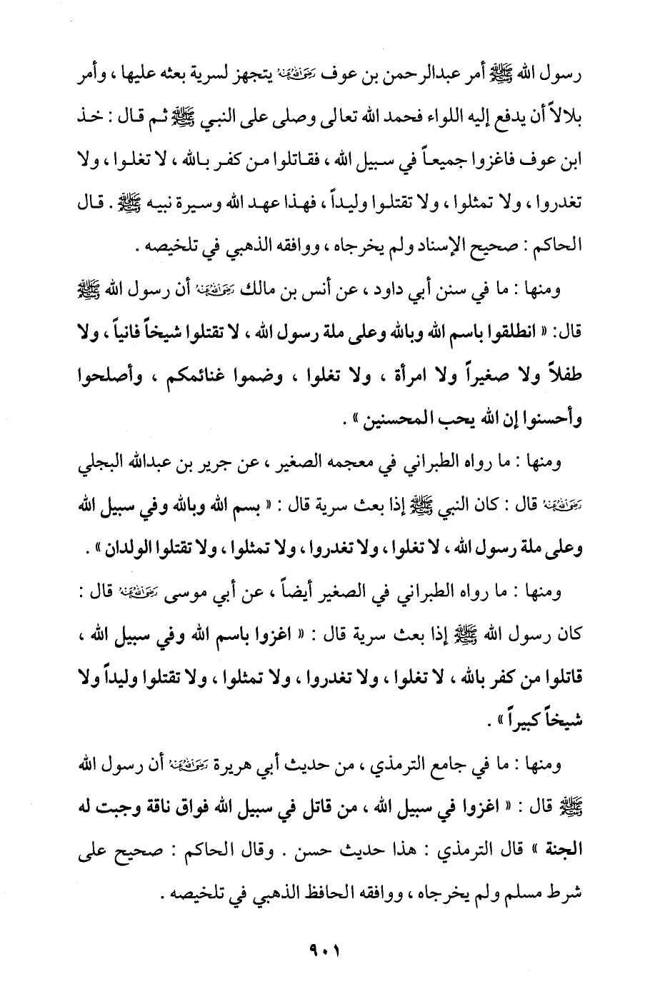 رسول الله - صلى الله عليه وسلم - أمر عبد الرحمن بن عوف - رضي الله عنه - يتجهز لسرية بعثه عليها، وأمر بلالاً أن يدفع إليه اللواء، فحمد الله تعالى وصلى على النبي - صلى الله عليه وسلم - ثم قال: خذ ابن عوف فاغزوا جميعا في سبيل الله، فقاتلوا من كفر بالله، لا تغلوا، ولا تغدروا، ولا تمثلوا، ولا تقتلوا وليدًا، فهذا عهد الله وسيرة نبيه - صلى الله عليه وسلم -. قال الحاكم: صحيح الإسناد ولم يخرجاه، ووافقه الذهبي في تلخيصه.