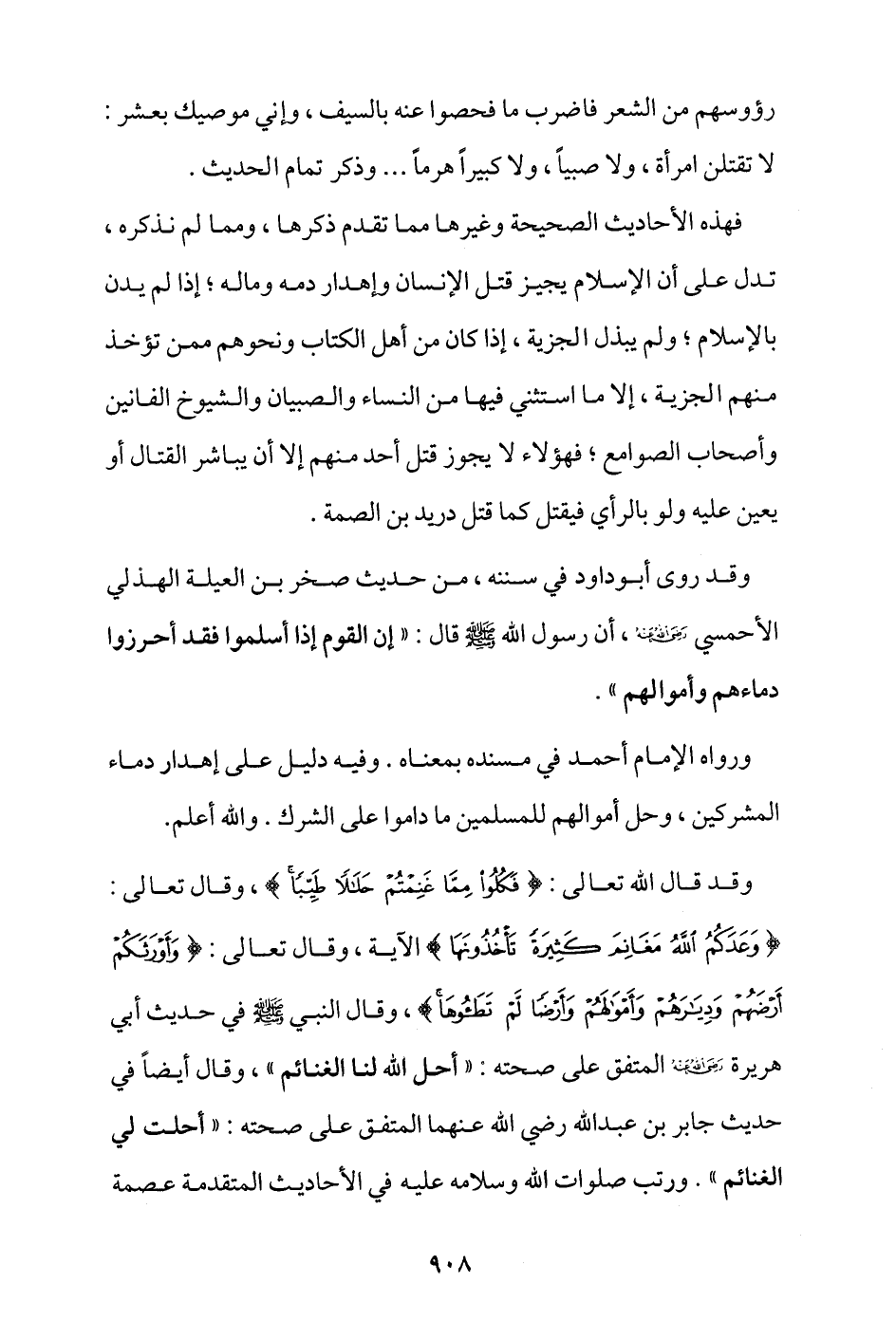 وقد قال الله تعالى: {فَكُلُوا مِمَّا غَنِمْتُمْ حَلَالًا طَيِّبًا}، وقال تعالى: {وَعَدَكُمُ اللَّهُ مَغَانِمَ كَثِيرَةً تَاخُذُونَهَا} الآية، وقال تعالى: {وَأَوْرَثَكُمْ أَرْضَهُمْ وَدِيَارَهُمْ وَأَمْوَالَهُمْ وَأَرْضًا لَمْ تَطَئُوهَا} وقال النبي - صلى الله عليه وسلم - في حديث أبي هريرة - رضي الله عنه - المتفق على صحته: «أحل الله لنا الغنائم»، وقال أيضا في حديث جابر بن عبد الله -رضي الله عنهما- المتفق على صحته: «أحلت لي الغنائم»، ورتب صلوات الله وسلامه عليه في الأحاديث المتقدمة عصمة