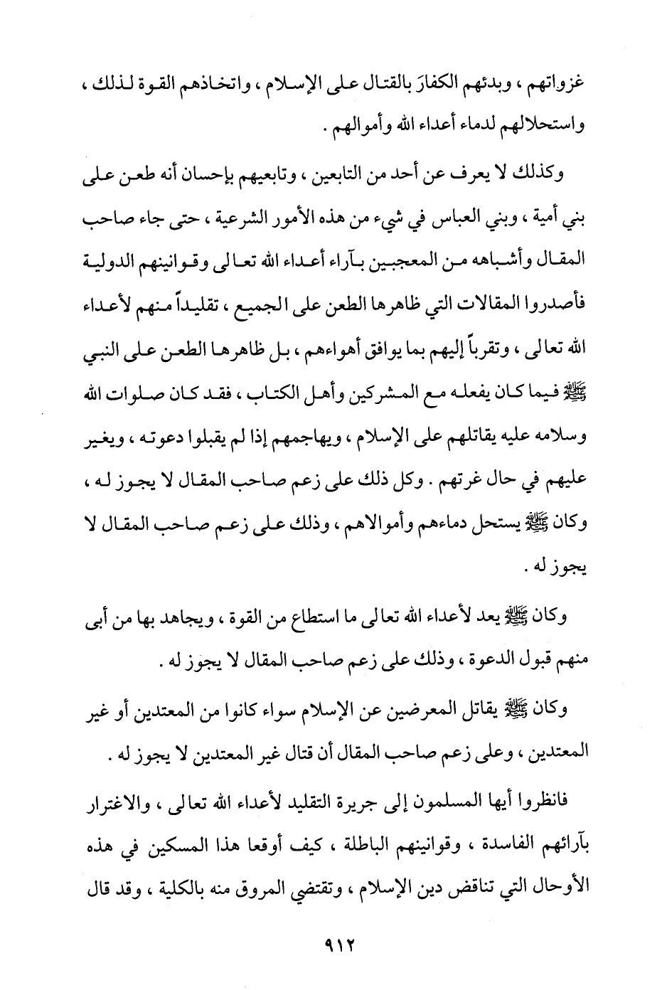 وكذلك لا يعرف عن أحد من التابعين وتابعيهم بإحسان، أنه طعن على بني أمية وبني العباس في شيء من هذه الأمور الشرعية، حتى جاء صاحب المقال وأشباهه من المعجبين بآراء أعداء الله تعالى وقوانينهم الدولية، فأصدروا المقالات التي ظاهرها الطعن على الجميع، تقليدًا منهم لأعداء الله تعالى، وتقربًا إليهم بما يوافق أهواءهم، بل ظاهرها الطعن على النبي - صلى الله عليه وسلم - فيما كان يفعله مع المشركين وأهل الكتاب، فقد كان صلوات الله وسلامه عليه يقاتلهم على الإسلام، ويهاجمهم إذا لم يقبلوا دعوته، ويغير عليهم في حال غرتهم، وكل ذلك على زعم صاحب المقال لا يجوز له، وكان - صلى الله عليه وسلم - يستحل دماءهم وأموالهم، وذلك على زعم صاحب المقال لا يجوز له.