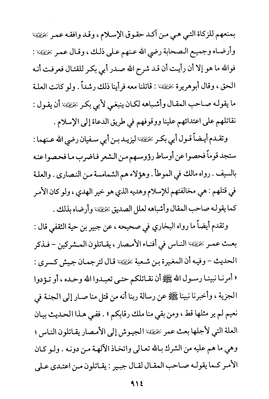 وتقدم أيضا ما رواه البخاري في صحيحه، عن جبير بن حية الثقفي قال: بعث عمر - رضي الله عنه - الناس في أفناء الأمصار، يقاتلون المشركين -فذكر الحديث- وفيه أن المغيرة بن شعبة - رضي الله عنه - قال لترجمان جيش كسرى: «أمرنا نبينا رسول الله - صلى الله عليه وسلم - أن نقاتلكم حتى تعبدوا الله وحده، أو تؤدوا الجزية، وأخبرنا نبينا - صلى الله عليه وسلم - عن رسالة ربنا أنه من قُتل منا صار إلى الجنة في نعيم لم ير مثلها قط، ومن بقي منا ملك رقابكم»، ففي هذا الحديث بيان العلة التي لأجلها بعث عمر - رضي الله عنه - الجيوش إلى الأمصار يقاتلون الناس؛ وهي ما هم عليه من الشرك بالله تعالى واتخاذ الآلهة من دونه، ولو كان الأمر كما يقوله صاحب المقال لقال جبير: يقاتلون من اعتدى على