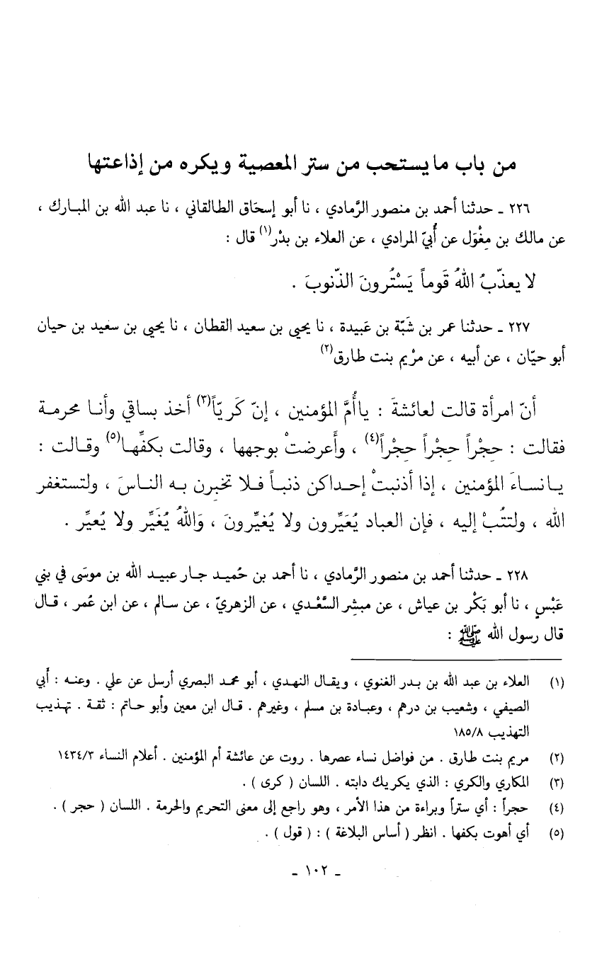 226 - حَدثنَا أَحْمد بن مَنْصُور الرَّمَادِي نَا أَبُو إِسْحَاق الطَّالقَانِي نَا عَبْدُ اللَّهِ بْنُ الْمُبَارَكِ عَنْ مَالِكِ بْنِ مِغْوَلٍ عَنْ أُبَيٍّ الْمُرَادِيِّ عَنِ الْعَلَاءِ بْنِ بدر قَالَ