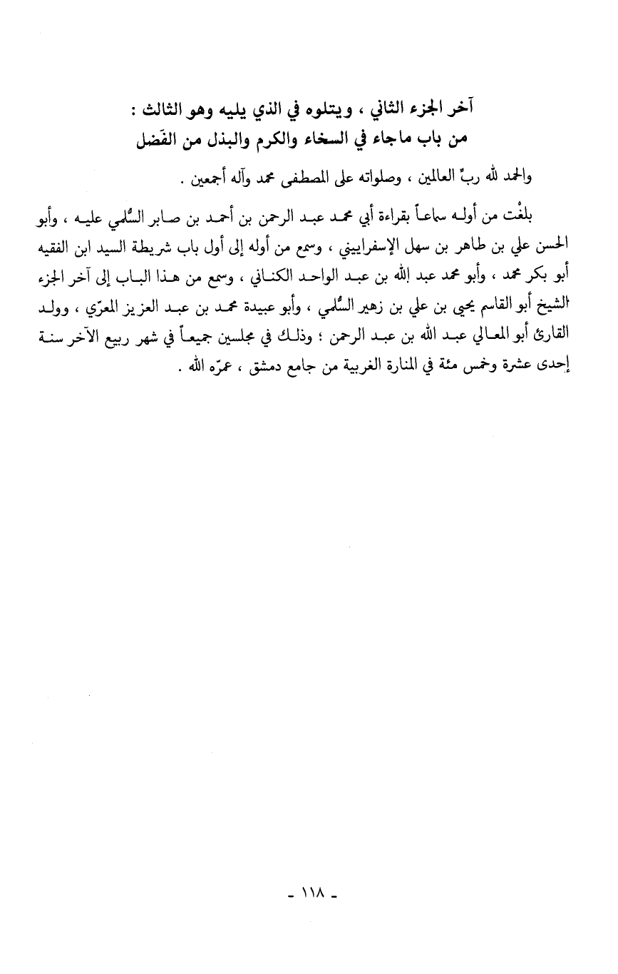 بلغت من أَوله سَمَاعا بِقِرَاءَة أبي مُحَمَّد عبد الرَّحْمَن بن أَحْمد بن صابر السّلمِيّ عَلَيْهِ وَأَبُو الْحسن عَليّ بن طَاهِر بن سهل الإِسْفِرَايِينِيّ وَسمع من أَوله إِلَى أول بَاب شريطة السَّيِّد ابْن الْفَقِيه أَبُو بكر مُحَمَّد وَأَبُو مُحَمَّد عبد الله بن عبد الْوَاحِد الْكِنَانِي وَسمع من هَذَا الْبَاب إِلَى آخر الْجُزْء الشَّيْخ أَبُو الْقَاسِم يحيى بن عَليّ بن زُهَيْر السّلمِيّ وَأَبُو عُبَيْدَة مُحَمَّد بن عبد الْعَزِيز المعري وَولد الْقَارئ أَبُو الْمَعَالِي عبد الله بن عبد الرَّحْمَن وَذَلِكَ فِي مجلسين جَمِيعًا فِي شهر ربيع الآخر سنة إِحْدَى عشرَة وَخمْس مئة فِي المنارة الغربية من جَامع دمشق عمره الله