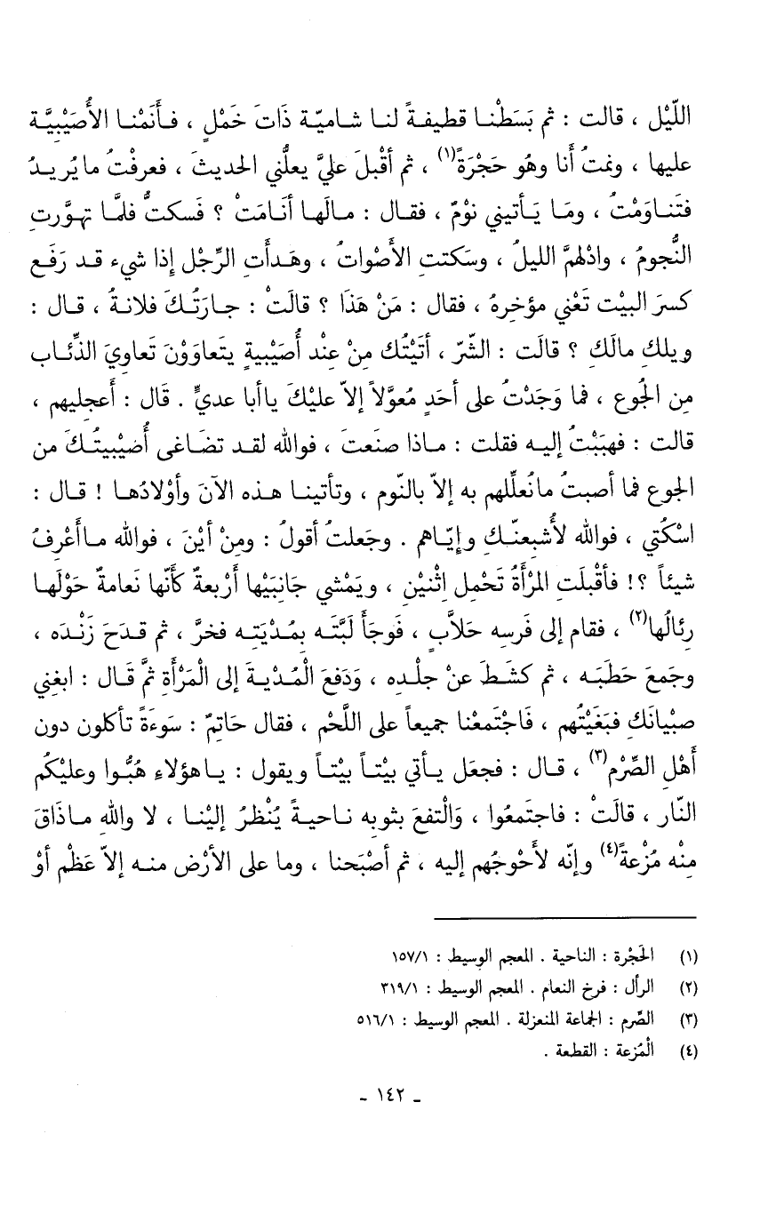 اللَّيْلِ قَالَتْ ثُمَّ بَسَطْنَا قَطِيفَةً لَنَا شَامِيَّةً ذَات خمل فأنمنا الأصيبية عَلَيْهَا ونمت أَنا وَهُوَ حُجْرَةٍ ثُمَّ أَقْبَلَ عَلَيَّ يُعِلُّنِي الْحَدِيثَ فَعَرَفْتُ مَا يُرِيدُ فَتَنَاوَمْتُ وَمَا يَأْتِينِي نَوْمٌ فَقَالَ مَالهَا أَنَامَتْ فَسَكَتُّ فَلَمَّا تَهَوَّرَتِ النُّجُومُ وَادْلَهَمَّ اللَّيْلُ وسكتت الْأَصْوَاتُ وَهَدَأَتِ الرِّجْلُ إِذَا شَيْءٌ قَدْ رَفَعَ كسر الْبَيْت تَعْنِي مُؤَخَّرَهُ فَقَالَ مَنْ هَذَا قَالَتْ جَارَتُكَ فُلَانَةُ قَالَ وَيلك مَالك قَالَت الشَّرّ أَتَيْتُك من عِنْد أصيبية يَتَعَاوَوْنَ تَعَاوِيَ الذِّئَابِ مِنَ الْجُوعِ فَمَا وَجَدْتُ عَلَى أَحَدٍ مُعَوَّلًا إِلَّا عَلَيْكَ يَا أَبَا عَدِيٍّ