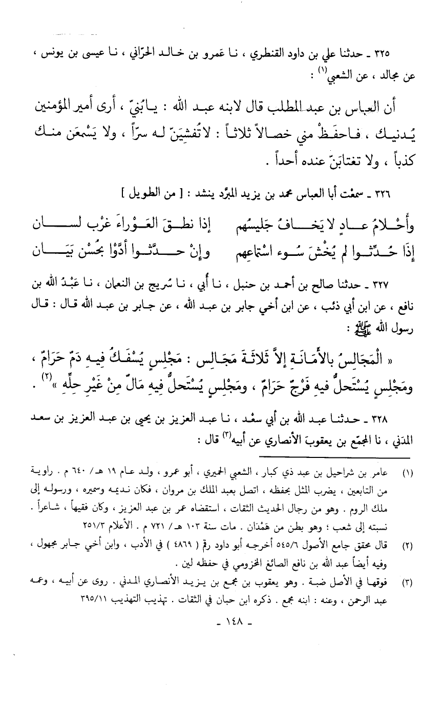 325 - حَدثنَا عَليّ بن دَاوُد الْقَنْطَرِي نَا عَمْرو بن خَالِد الْحَرَّانِي نَا عِيسَى بْنُ يُونُسَ عَنْ مُجَالِدٍ عَنِ الشَّعْبِيِّ