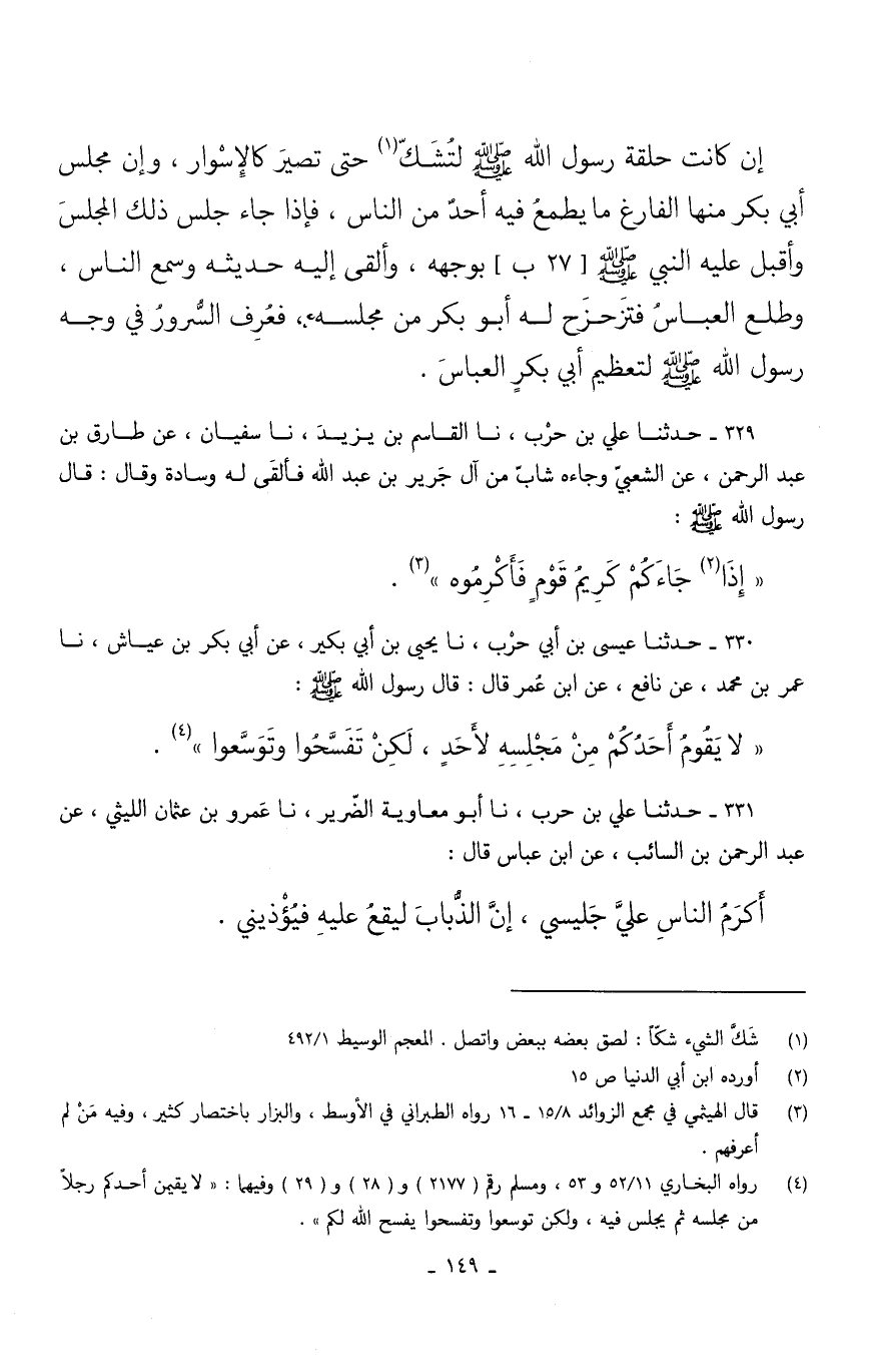 إِنْ كَانَتْ حَلْقَةُ رَسُولِ اللَّهِ صَلَّى اللَّهُ عَلَيْهِ وَسَلَّمَ لَتُشَكُّ حَتَّى تَصِيرَ كَالْإِسْوَارِ وَإِنَّ مَجْلِسَ أَبِي بَكْرٍ مِنْهَا الْفَارِغَ مَا يَطْمَعُ فِيهِ أَحَدٌ مِنَ النَّاسِ فَإِذَا جَاءَ جَلَسَ ذَلِكَ الْمَجْلِسَ وَأَقْبَلَ عَلَيْهِ النَّبِيُّ صَلَّى اللَّهُ عَلَيْهِ وَسلم بِوَجْهِهِ وألفى إِلَيْهِ حَدِيثَهُ وَسَمِعَ النَّاسَ وَطَلَعَ الْعَبَّاسُ فَتَزَحْزَحَ لَهُ أَبُو بَكْرٍ مِنْ مَجْلِسِهِ فَعُرِفَ السُّرُورُ فِي وَجْهِ رَسُولِ اللَّهِ صَلَّى اللَّهُ عَلَيْهِ وَسَلَّمَ لِتَعْظِيمِ أَبِي بَكْرٍ الْعَبَّاسَ