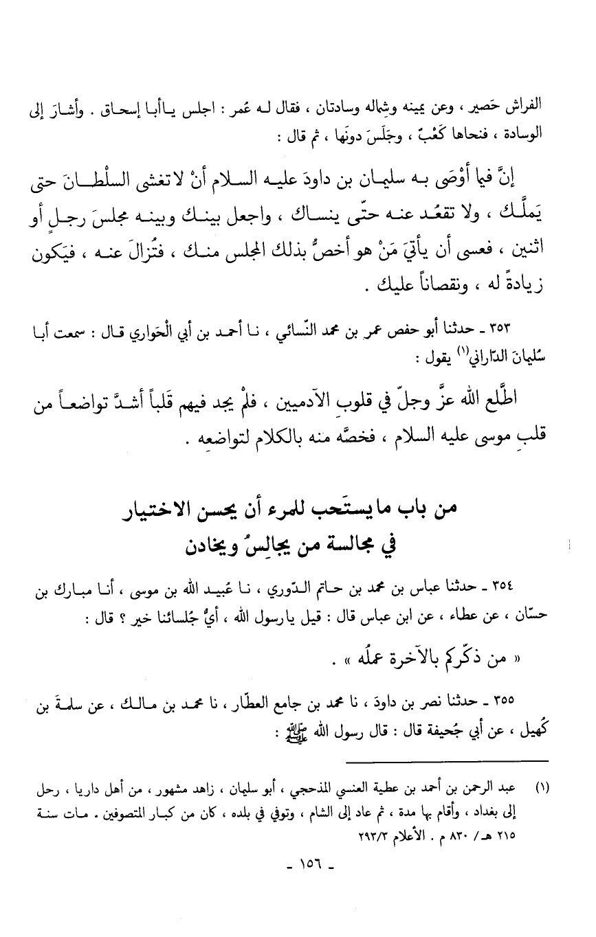 إِنَّ فِيمَا أَوْصَى بِهِ سُلَيْمَانُ بْنُ دَاوُدَ عَلَيْهِ السَّلَامُ أَنْ لَا تَغْشَى السُّلْطَانَ حَتَّى يَمَلَّكَ وَلَا تَقْعُدْ عَنْهُ حَتَّى يَنْسَاكَ وَاجْعَلْ بَيْنَكَ وَبَيْنَهُ مَجْلِسَ رَجُلٍ أَوِ اثْنَيْنِ فَعَسَى أَنْ يَأْتِيَ مَنْ هُوَ أَخَصُّ بِذَلِكَ الْمَجْلِسِ مِنْكَ فَتُزَالَ عَنْهُ فَيَكُونَ زِيَادَةً لَهُ ونقصانا ونقصانا عَلَيْك