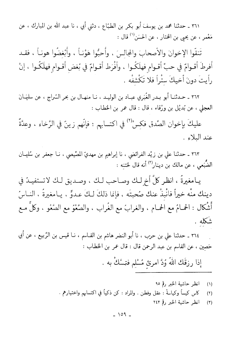 364 - حَدثنَا عَليّ بن حَرْب نَا أَبُو النَّضر هَاشم بن الْقَاسِم نَا قَيْسُ بْنُ الرَّبِيعِ عَنْ أَبِي حُصَيْنٍ عَنِ الْقَاسِمِ بْنِ عَبْدِ الرَّحْمَنِ قَالَ قَالَ عُمَرُ بْنُ الْخَطَّابِ