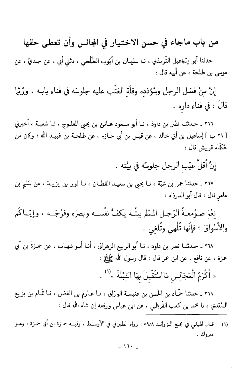 إِنَّ مِنْ فَضْلِ الرَّجُلِ وَسُؤْدَدِهِ وَقِلَّةِ الْعَتْبِ عَلَيْهِ جُلُوسَهُ فِي فِنَاءِ بَابِهِ وَرُبَّمَا قَالَ فِي فِنَاءِ دَارِهِ