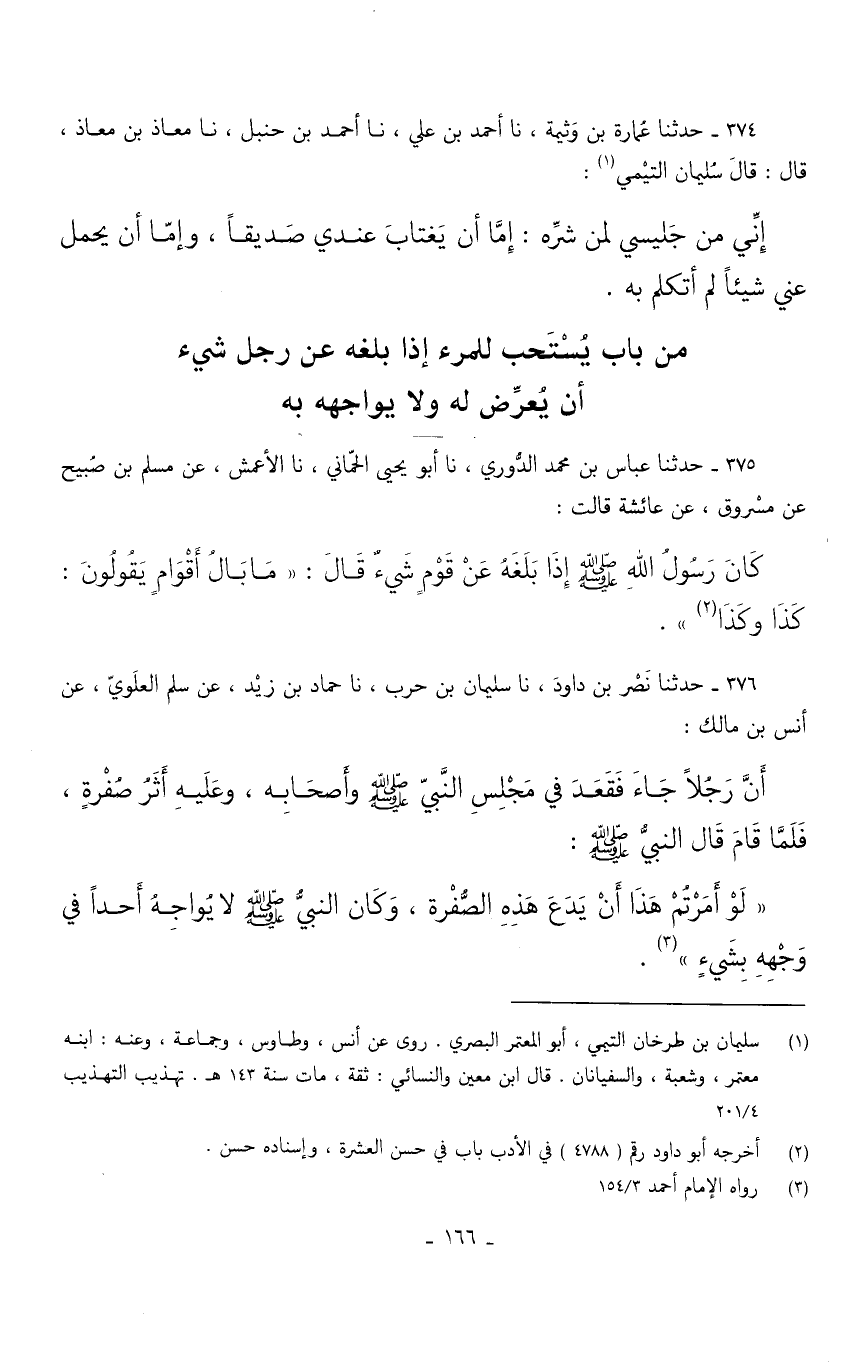 من بَاب يُسْتَحَبُّ لِلْمَرْءِ إِذَا بَلَغَهُ عَنْ رَجُلٍ شَيْءٌ أَنْ يُعَرِّضَ لَهُ وَلَا يُوَاجِهَهُ بِهِ