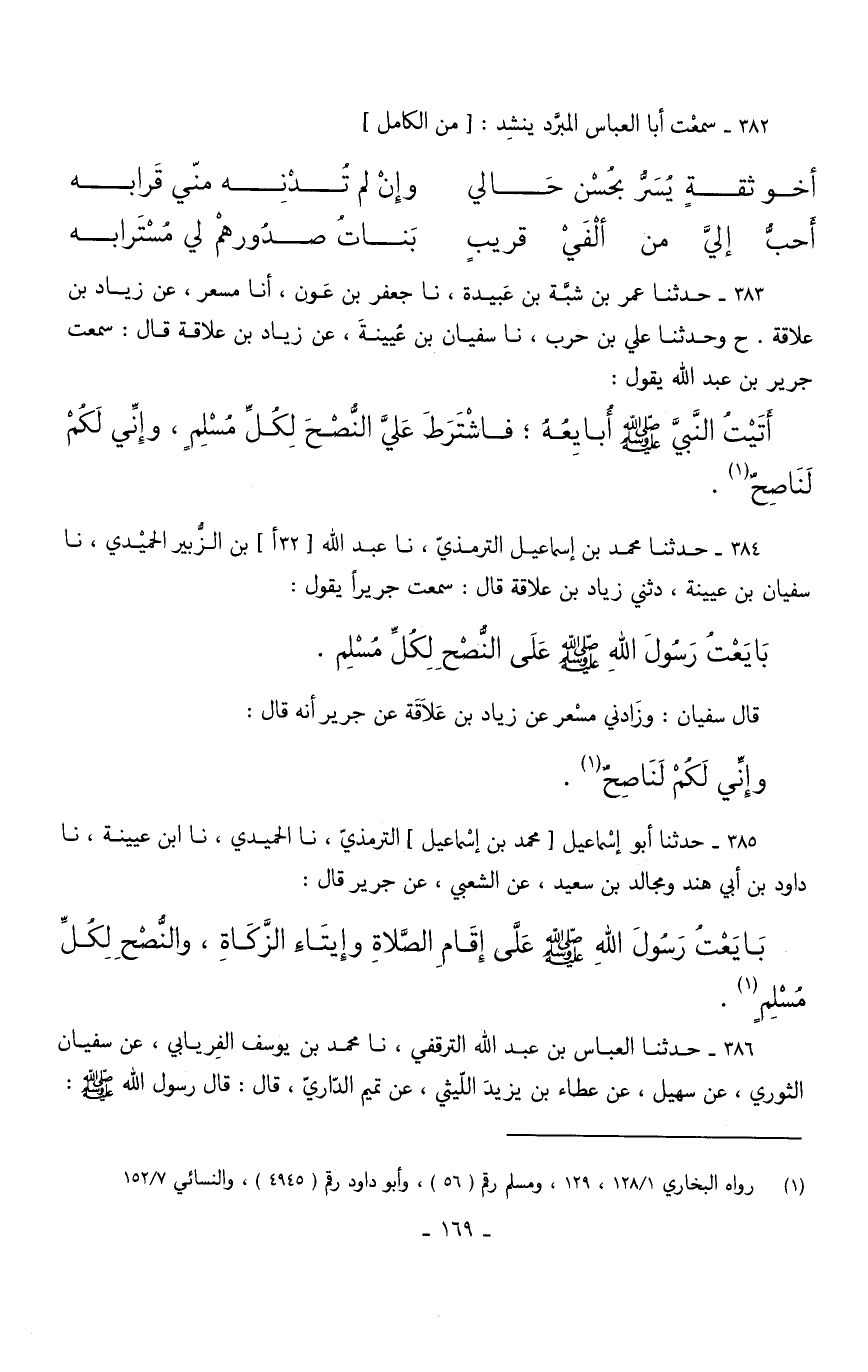 بَايَعْتُ رَسُولَ اللَّهِ صَلَّى اللَّهُ عَلَيْهِ وَسَلَّمَ عَلَى النُّصْحِ لِكُلِّ مُسْلِمٍ