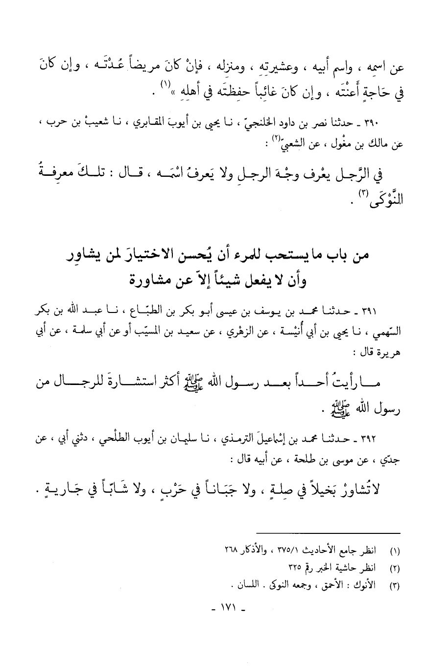 من بَابُ مَا يُسْتَحَبُّ لِلْمَرْءِ أَنْ يُحْسِنَ الِاخْتِيَارَ لمن يُشَاوِرُ وَأَنْ لَا يَفْعَلَ شَيْئًا إِلَّا عَنْ مُشَاورَة