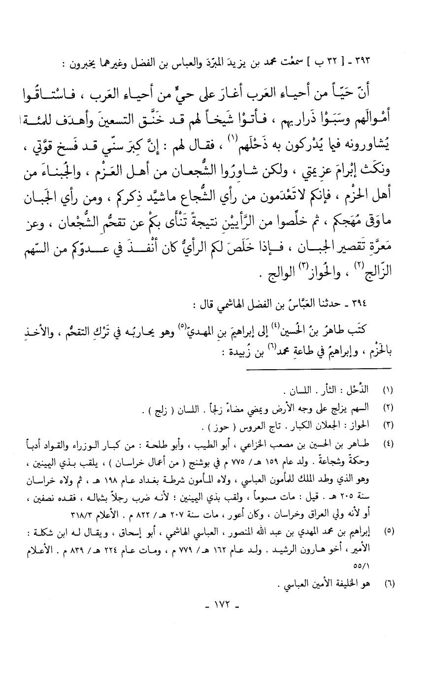 393 - سَمِعْتُ مُحَمَّدَ بْنَ يَزِيدَ الْمُبَرِّدَ وَالْعَبَّاسَ بْنَ الْفضل وَغَيْرَهُمَا يُخْبِرُونَ