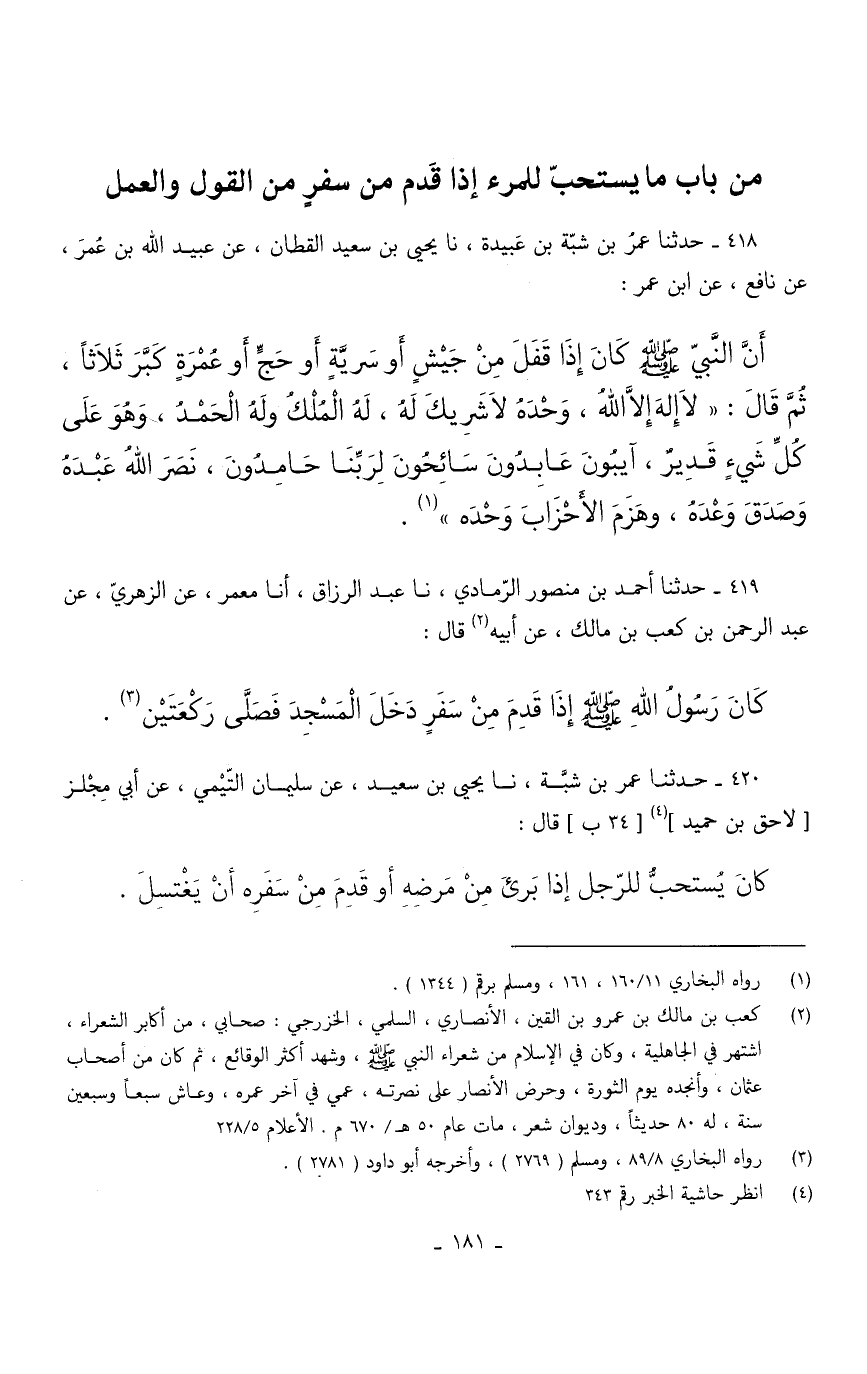 أَنَّ النَّبِيَّ صَلَّى اللَّهُ عَلَيْهِ وَسَلَّمَ كَانَ إِذَا قَفَلَ مِنْ جَيْشٍ أَوْ سَرِيَّةٍ أَوْ حَجٍّ أَوْ عُمْرَةٍ كَبَّرَ ثَلَاثًا ثُمَّ قَالَ لَا إِلَهَ إِلَّا اللَّهُ وَحْدَهُ لَا شَرِيكَ لَهُ لَهُ الْمُلْكُ وَلَهُ الْحَمْدُ وَهُوَ عَلَى كُلِّ شَيْءٍ قَدِيرٌ آيِبُونَ عَابِدُونَ سَائِحُونَ لِرَبِّنَا حَامِدُونَ نَصَرَ اللَّهُ عَبْدَهُ وَصَدَقَ وَعْدَهُ وَهَزَمَ الْأَحْزَاب وَحده