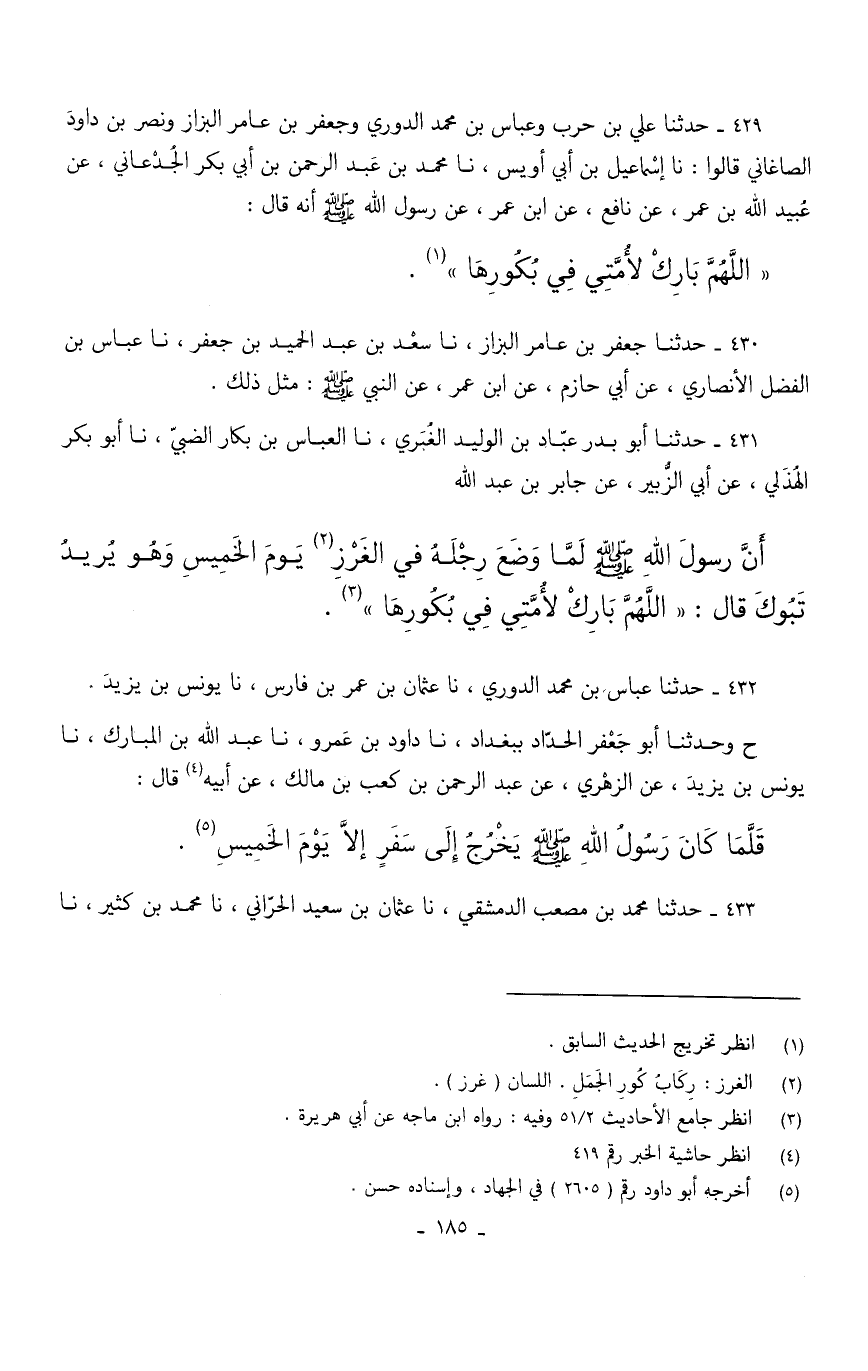 أَنَّ رَسُولَ اللَّهِ صَلَّى اللَّهُ عَلَيْهِ وَسَلَّمَ لَمَّا وَضَعَ رِجْلَهُ فِي الْغَرْزِ يَوْمَ الْخَمِيسِ وَهُوَ يُرِيدُ تَبُوكَ قَالَ اللَّهُمَّ بَارِكْ لِأُمَّتِي فِي بُكُورِهَا