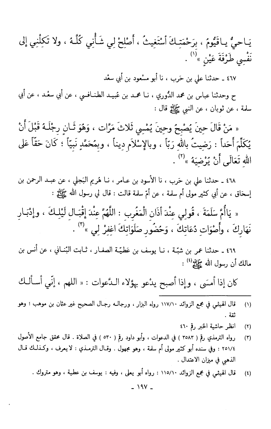 مَنْ قَالَ حِينَ يُصْبِحُ وَحِينَ يُمْسِي ثَلَاثَ مَرَّاتٍ وَهُوَ ثَانٍ رِجْلَهُ قَبْلَ أَنْ يُكَلِّمَ أَحَدًا رَضِيتُ بِاللَّهِ رِبًا وَبِالْإِسْلَامِ دِينًا وَبِمُحَمَّدٍ نَبِيًّا كَانَ حَقًّا عَلَى اللَّهِ تَعَالَى أَنْ يُرْضِيَهُ