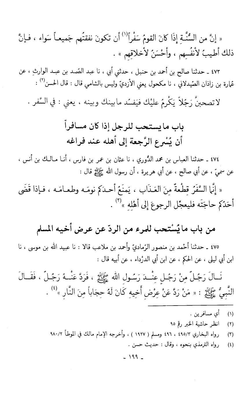 إِنَّ مِنَ السُّنَّةِ إِذَا كَانَ الْقَوْمُ سَفْرًا أَنْ تَكُونَ نَفَقَتُهُمْ جَمِيعًا سَوَاءً فَإِنَّ ذَلِكَ أَطْيَبُ لِأَنْفُسِهِمْ وَأَحْسَنُ لِأَخْلَاقِهِمْ