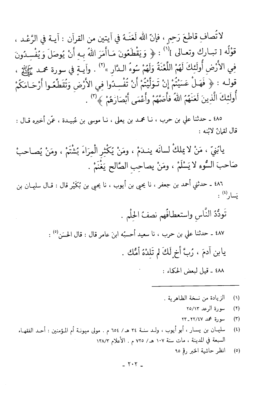 لَا تُصَافِ قَاطِعَ رَحِمٍ فَإِنَّ اللَّهَ لَعَنَهُ فِي آيَتَيْنِ مِنَ الْقُرْآنِ آيَةٍ فِي الرَّعْدِ قَوْلُهُ تَبَارَكَ وَتَعَالَى {وَيَقْطَعُونَ مَا أَمَرَ اللَّهُ بِهِ أَنْ يُوصَلَ وَيُفْسِدُونَ فِي الْأَرْضِ أُولَئِكَ لَهُم اللَّعْنَة وَلَهُم سوء الدَّار}