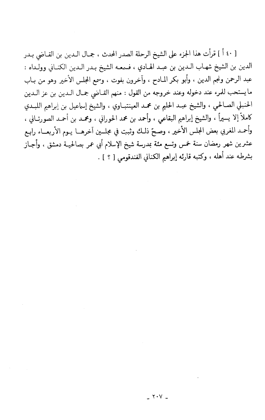 قَرَأت هَذَا الْجُزْء عَليّ الشَّيْخ الرحلة الصَّدْر الْمُحدث جمال الدّين بن القَاضِي بدر الدّين بن الشَّيْخ شهَاب الدّين بن عبد الْهَادِي فَسَمعهُ الشَّيْخ بدر الدّين الْكِنَانِي وولداه عبد الرَّحْمَن وَنجم الدّين وَأَبُو بكر المادح وَآخَرُونَ بفوت وَسمع الْمجْلس الْأَخير وَهُوَ من بَاب مَا يسْتَحبّ للمرء عِنْد دُخُوله وَعند خُرُوجه من القَوْل مِنْهُم القَاضِي جمال الدّين بن عز الدّين الْحَنْبَلِيّ الصَّالِحِي وَالشَّيْخ عبد الْحَلِيم بن مُحَمَّد العينتباوي وَالشَّيْخ إِسْمَاعِيل بن إِبْرَاهِيم اللبدي كَامِلا إِلَّا يَسِيرا وَالشَّيْخ إِبْرَاهِيم البقاعي وَأحمد بن مُحَمَّد الحوراني وَمُحَمّد بن أَحْمد الصورتاني وَأحمد المغربي بعض الْمجْلس الْأَخير وَصَحَّ ذَلِك وَثَبت فِي مجلسين آخرهَا يَوْم الْأَرْبَعَاء رَابِع عشْرين شهر رَمَضَان سنة خمس وتسع مئة بمدرسة شيخ الْإِسْلَام أبي عمر بصالحية دمشق وَأَجَازَ بِشَرْطِهِ عِنْد أَهله وَكتبه قارئه إِبْرَاهِيم الْكِنَانِي الفندقومي