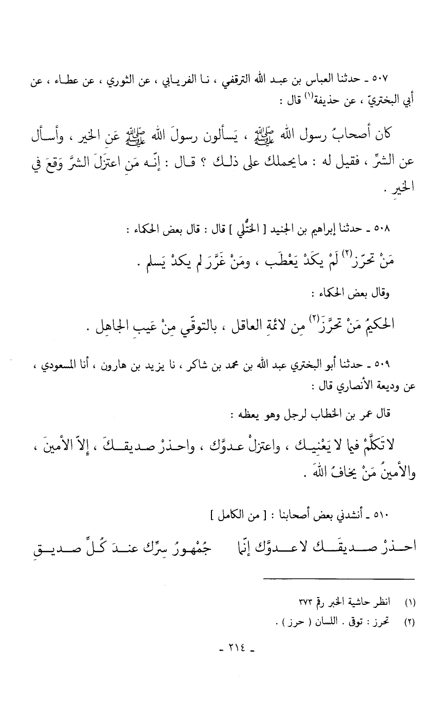 لَا تكلم فِيمَا لَا يَعْنِيكَ وَاعْتَزِلْ عَدُوَّكَ وَاحْذَرْ صَدِيقَكَ إِلَّا الْأَمِينَ وَالْأَمِينُ مَنْ يَخَافُ اللَّهَ