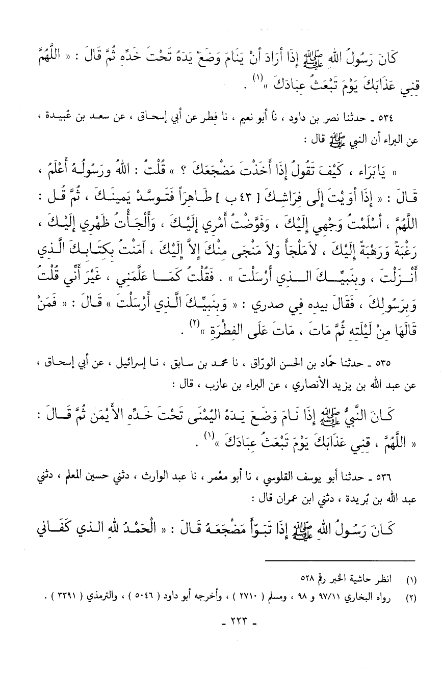 يَا بَرَاءُ كَيْفَ تَقُولُ إِذَا أَخَذْتَ مَضْجَعَكَ قُلْتُ اللَّهُ وَرَسُولُهُ أَعْلَمُ قَالَ إِذَا أَوَيْتَ إِلَى فِرَاشِكَ طَاهِرًا فَتَوَسَّدْ يَمِينَكَ ثُمَّ قُلْ اللَّهُمَّ أَسْلَمْتُ وَجْهِي إِلَيْكَ وَفَوَّضْتُ أَمْرِي إِلَيْكَ وَأَلْجَأْتُ ظَهْرِي إِلَيْكَ رَغْبَةً وَرَهْبَةً إِلَيْكَ لَا مَلْجَأَ وَلَا مَنْجَى مِنْكَ إِلَّا إِلَيْكَ آمَنْتُ بِكِتَابِكَ الَّذِي أَنْزَلْتَ وَبِنَبِيِّكَ الَّذِي أَرْسَلْتَ