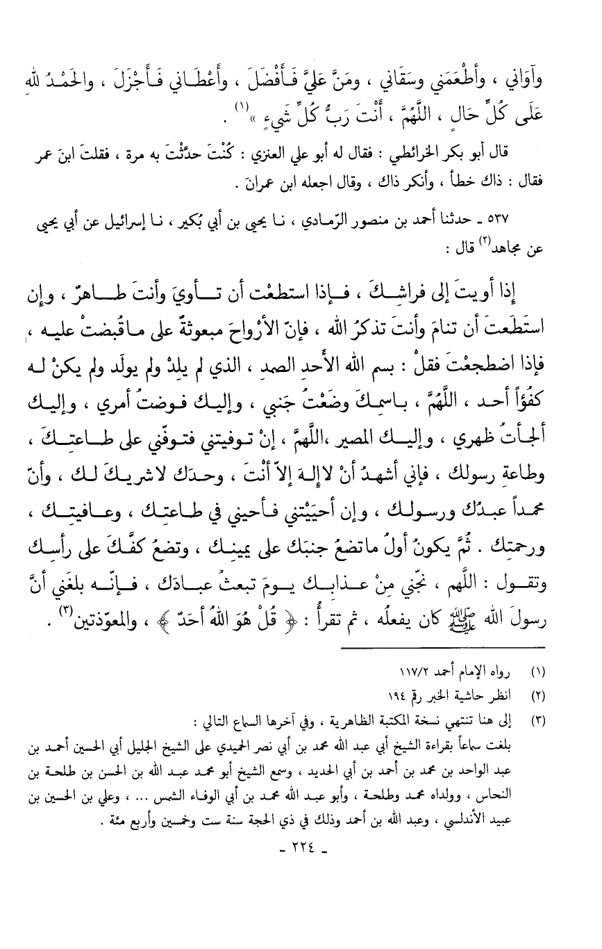 إِذَا أَوَيْتَ إِلَى فِرَاشِكَ فَإِذَا اسْتَطَعْتَ أَنْ تَأْوِيَ وَأَنْتَ طَاهِرٌ وَإِنِ اسْتَطَعْتَ أَنْ تَنَامَ وَأَنْتَ تَذْكُرُ اللَّهَ فَإِنَّ الْأَرْوَاحَ مَبْعُوثَةٌ عَلَى مَا قُبِضَتْ عَلَيْهِ فَإِذَا اضْطَجَعْتَ فَقُلْ بِسْمِ اللَّهِ الْأَحَدِ الصَّمَدِ الَّذِي لَمْ يَلِدْ وَلَمْ يُولد وَلم يكن لَهُ كُفؤًا أَحَدٌ اللَّهُمَّ بِاسْمِكَ وَضَعْتُ جَنْبِي وَإِلَيْكَ فَوَّضْتُ أَمْرِي وَإِلَيْكَ أَلْجَأْتُ ظَهْرِي وَإِلَيْكَ الْمَصِيرُ اللَّهُمَّ إِنْ تَوَفَّيْتَنِي فَتَوَفَّنِي عَلَى طَاعَتِكَ وَطَاعَةِ رَسُولِكَ فَإِنِّي أَشْهَدُ أَنْ لَا إِلَهَ إِلَّا أَنْتَ وَحدك لَا شريكك لَكَ وَأَنَّ مُحَمَّدًا عَبْدُكَ وَرَسُولُكَ وَإِنْ أَحْيَيْتَنِي فَأَحْيِنِي فِي طَاعَتِكَ وَعَافِيَتِكَ وَرَحْمَتِكَ