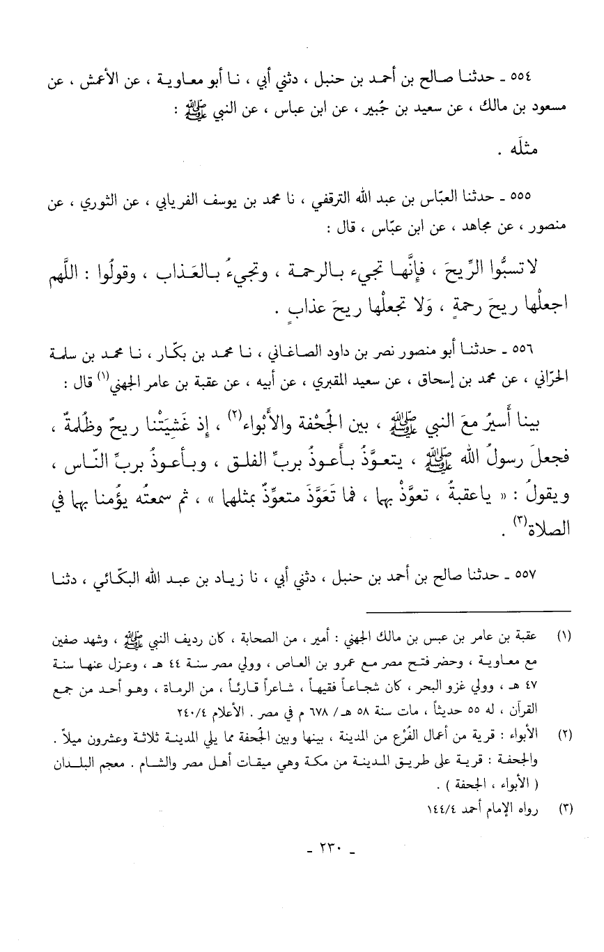 بَينا أَسِيرُ مَعَ النَّبِيِّ صَلَّى اللَّهُ عَلَيْهِ وَسَلَّمَ بَين الْجحْفَة والأبواء إِذْ غشيتنا رِيحٌ وَظُلْمَةٌ فَجَعَلَ رَسُولُ اللَّهِ صَلَّى اللَّهُ عَلَيْهِ وَسَلَّمَ يَتَعَوَّذُ بِأَعُوذُ بِرَبِّ الْفَلَقِ وَبِأَعُوذُ بِرَبِّ النَّاسِ وَيَقُولُ يَا عُقْبَةُ تَعَوَّذْ بِهِمَا فَمَا تَعَوَّذَ مُتَعَوِّذٌ بِمِثْلِهِمَا ثُمَّ سَمِعْتُهُ يَؤُمُّنَا بِهِمَا فِي الصَّلَاةِ