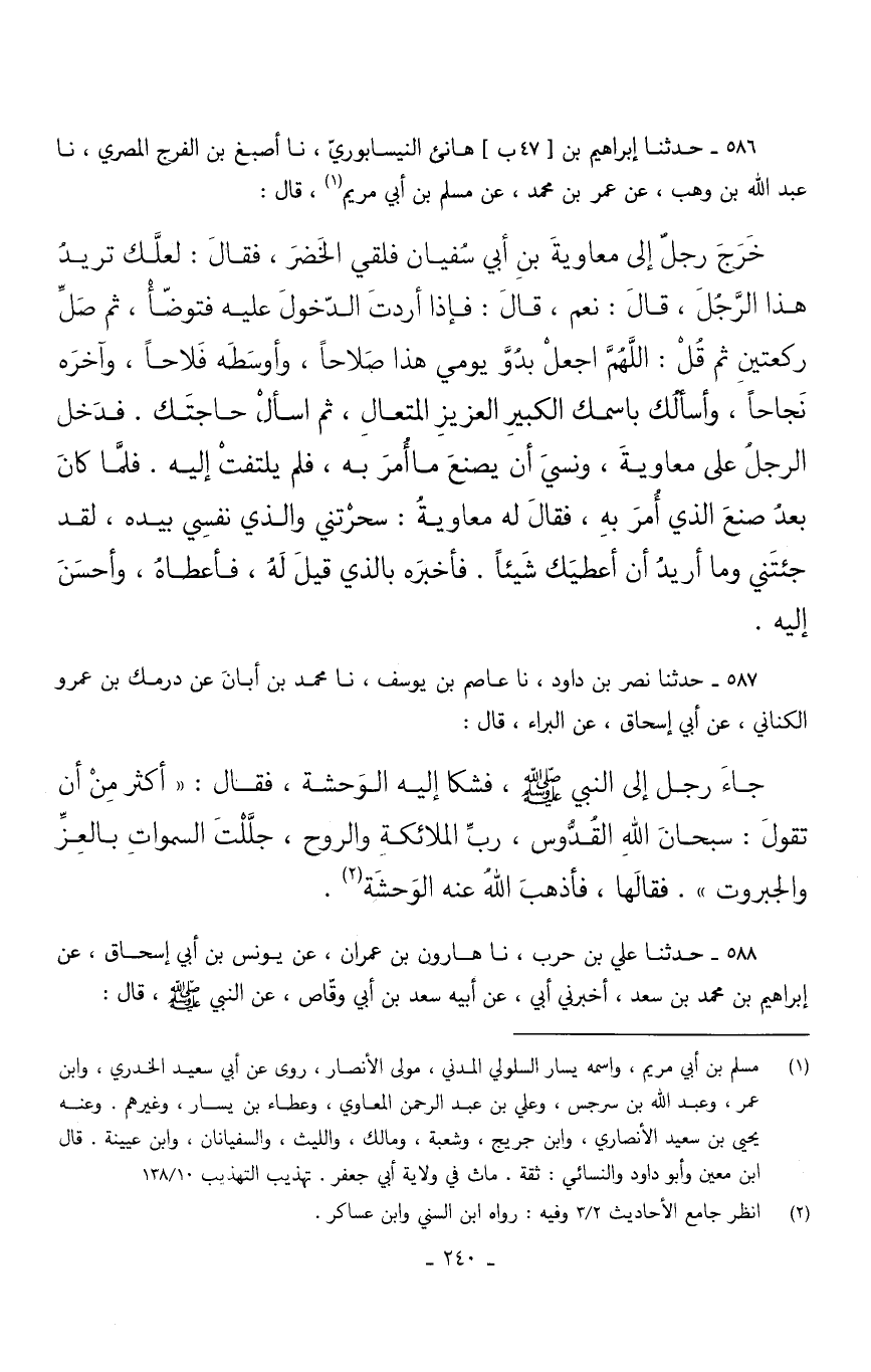 586 - حَدثنَا إِبْرَاهِيم بن هَانِئ النَّيْسَابُورِي نَا أصبغ بن الْفرج الْمصْرِيّ نَا عَبْدُ اللَّهِ بْنُ وَهْبٍ عَنْ عُمَرَ بْنِ مُحَمَّدٍ عَنْ مُسْلِمِ بْنِ أَبِي مَرْيَمَ قَالَ