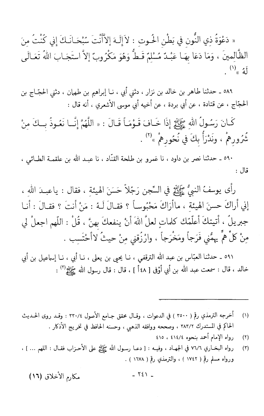 دَعْوَةُ ذِي النُّونِ فِي بَطْنِ الْحُوتِ لَا إِلَهَ إِلَّا أَنْتَ سُبْحَانَكَ إِنِّي كُنْتُ مِنَ الظَّالِمين وَمَا دَعَا بهَا عبد مُسْلِمٌ قَطُّ وَهُوَ مَكْرُوبٌ إِلَّا اسْتَجَابَ اللَّهُ تَعَالَى لَهُ