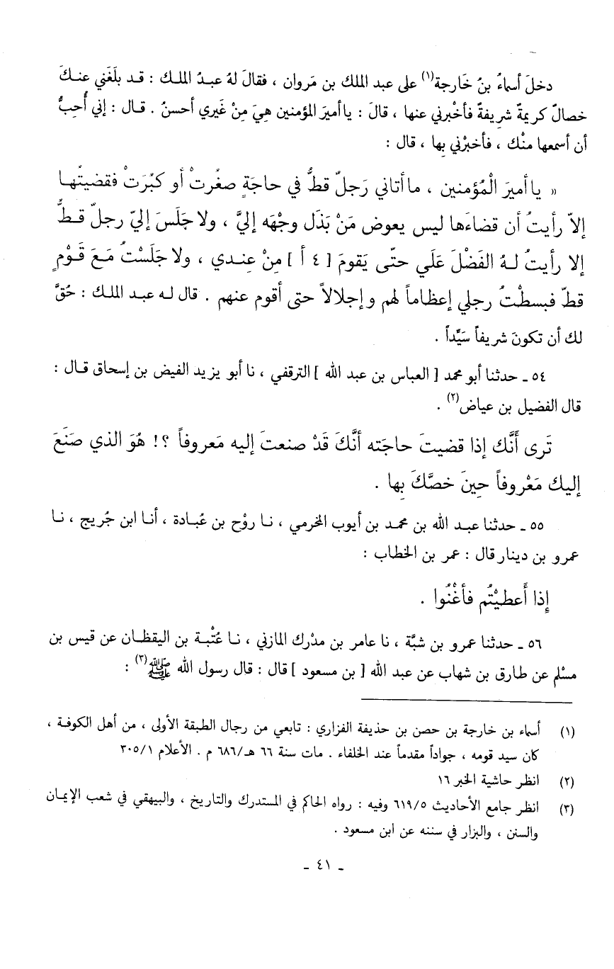 دَخَلَ أَسْمَاءُ بْنُ خَارِجَةَ عَلَى عَبْدِ الْمَلِكِ بْنِ مَرْوَانَ فَقَالَ لَهُ عَبْدُ الْمَلِكِ قَدْ بَلَغَنِي عَنْكَ خِصَالٌ كَرِيمَةٌ شَرِيفَةٌ فَأَخْبِرْنِي عَنْهَا قَالَ يَا أَمِيرَ الْمُؤْمِنِينَ هِيَ مِنْ غَيْرِي أَحْسَنُ قَالَ إِنِّي أُحِبُّ أَنْ أَسْمَعَهَا مِنْكَ فَأَخْبِرْنِي بِهَا قَالَ