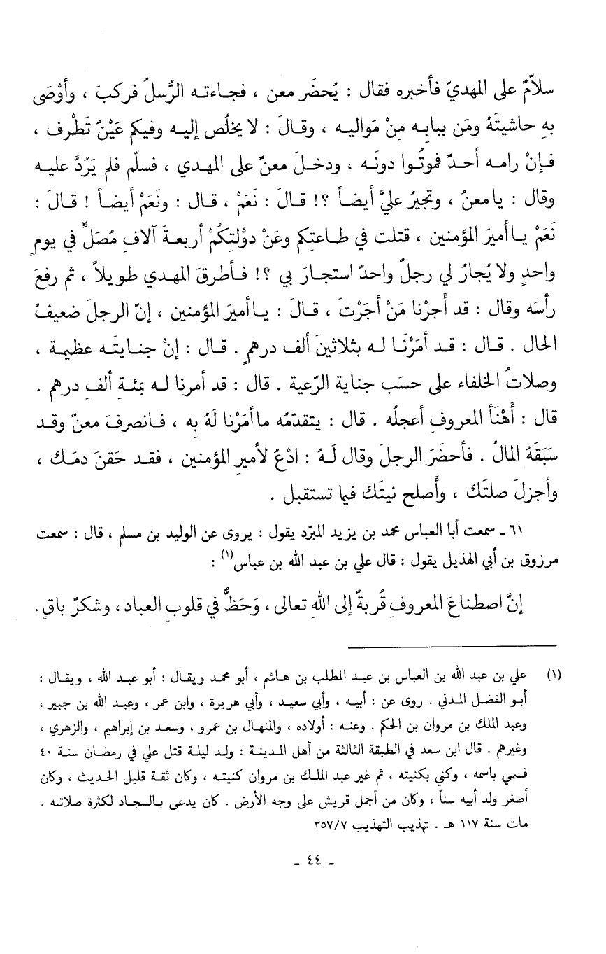61 - سَمِعْتُ أَبَا الْعَبَّاسِ مُحَمَّدَ بْنَ يَزِيدَ الْمُبَرِّدَ يَقُولُ يُرْوَى عَنِ الْوَلِيدِ بْنِ مُسْلِمٍ قَالَ سَمِعْتُ مَرْزُوقَ بْنَ أَبِي الْهُذَيْلِ يَقُولُ قَالَ عَلِيُّ بْنُ عَبْدِ اللَّهِ بْنِ عَبَّاسٍ