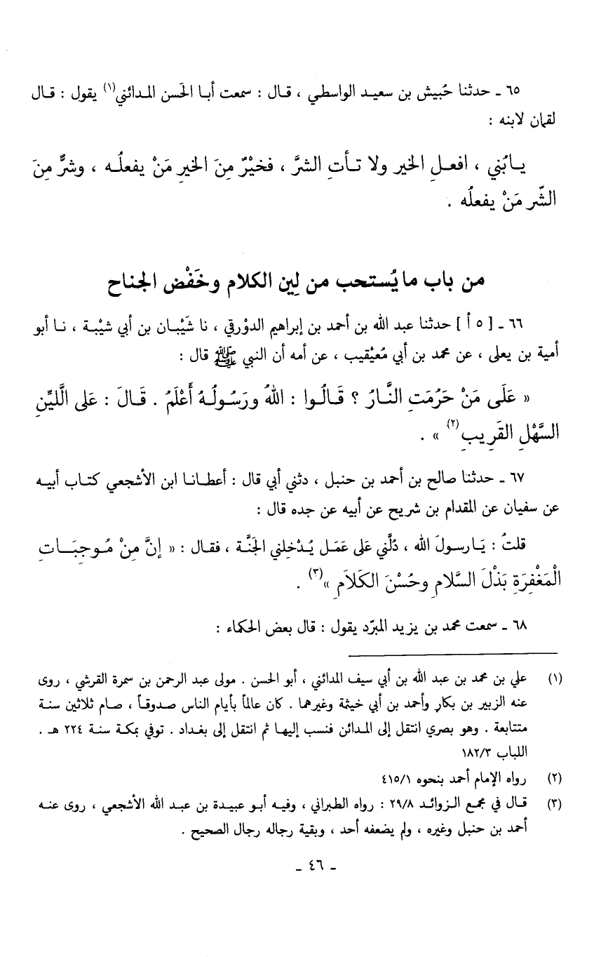 65 - حَدثنَا حُبَيْشُ بْنُ سَعِيدٍ الْوَاسِطِيُّ قَالَ سَمِعْتُ أَبَا الْحَسَنِ الْمَدَائِنِيَّ يَقُولُ قَالَ لُقْمَانُ لِابْنِهِ