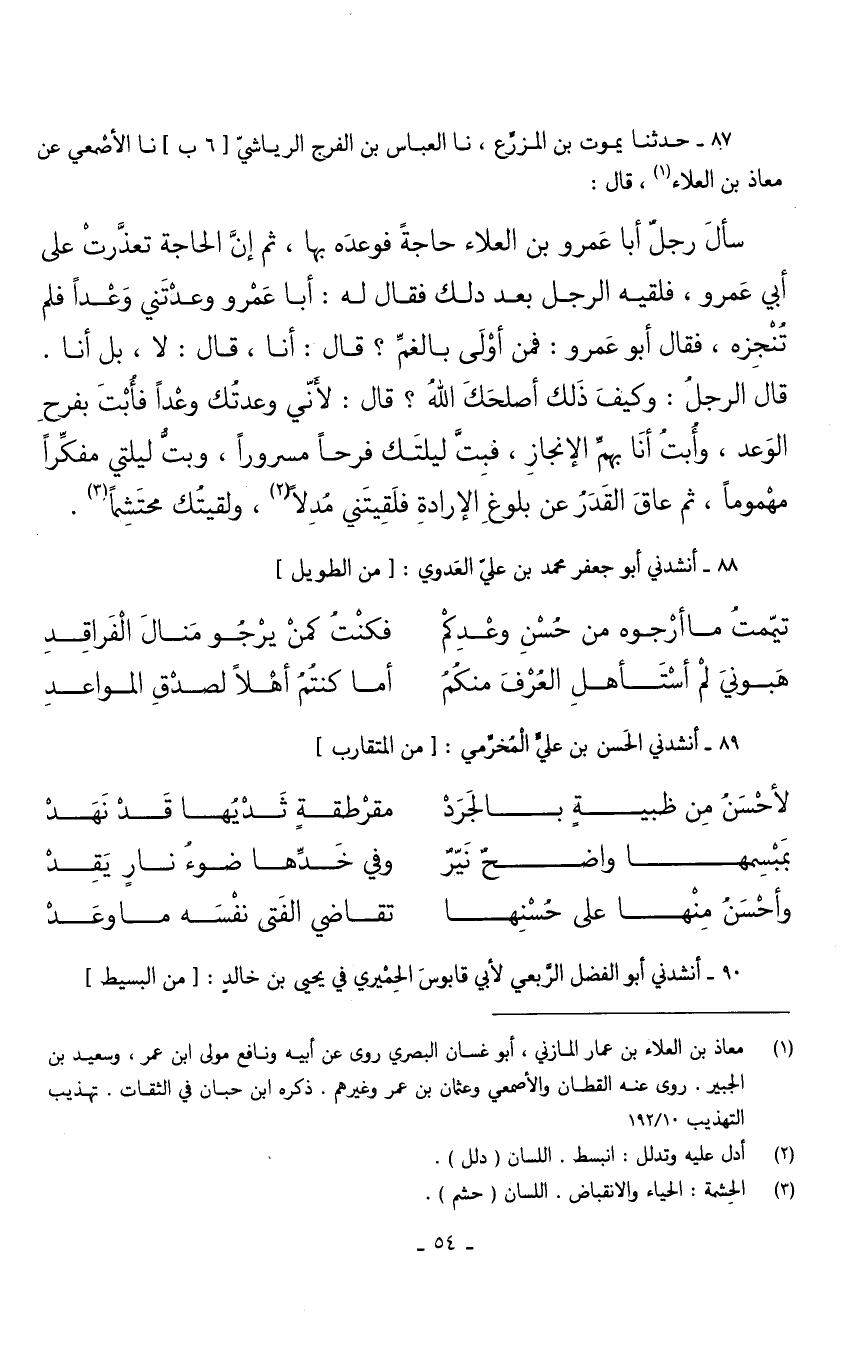 87 - حَدثنَا يَمُوت بن المزرع نَا الْعَبَّاس بن الْفرج الرياشي نَا الْأَصْمَعِيُّ عَنْ مُعَاذِ بْنِ الْعَلَاءِ قَالَ