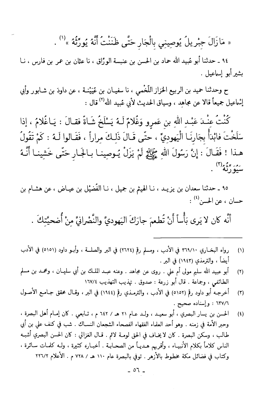 كُنْتُ عِنْدَ عبد الله بن عَمْرو وَغُلَام لَهُ يَسْلُخُ شَاةً فَقَالَ يَا غُلَامُ إِذَا سَلَخْتَ فَابْدَأْ بِجَارِنَا الْيَهُودِيِّ حَتَّى قَالَ ذَلِكَ مِرَارًا فَقَالُوا لَهُ كَمْ تَقُولُ هَذَا فَقَالَ إِنَّ رَسُولَ اللَّهِ صَلَّى اللَّهُ عَلَيْهِ وَسَلَّمَ لَمْ يَزَلْ يُوصِينَا بِالْجَارِ حَتَّى خَشِينَا أَنَّهُ سَيُوَرِّثُهُ