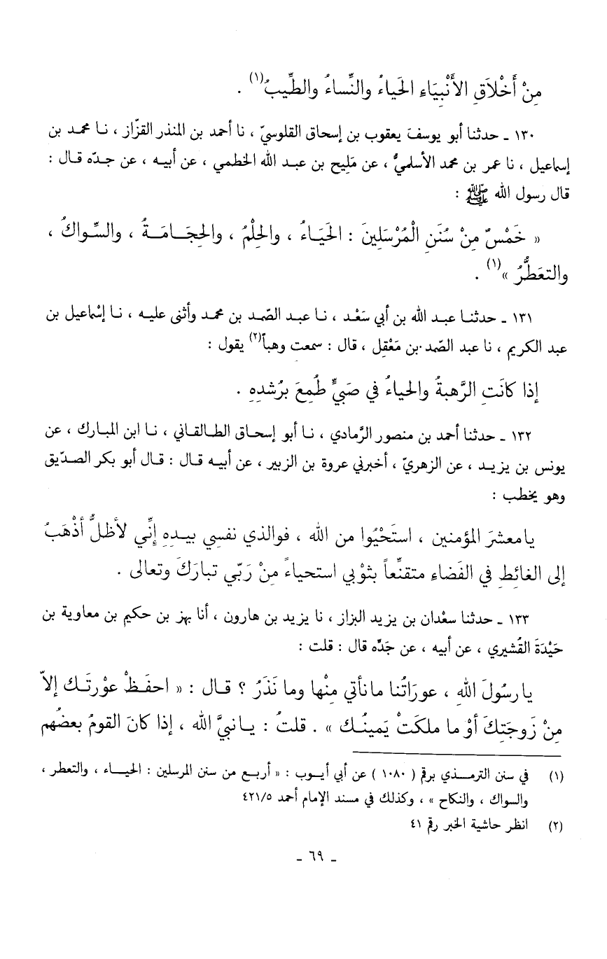 مِنْ أَخْلَاقِ الْأَنْبِيَاءِ الْحَيَاءُ وَالنِّسَاءُ وَالطِّيبُ