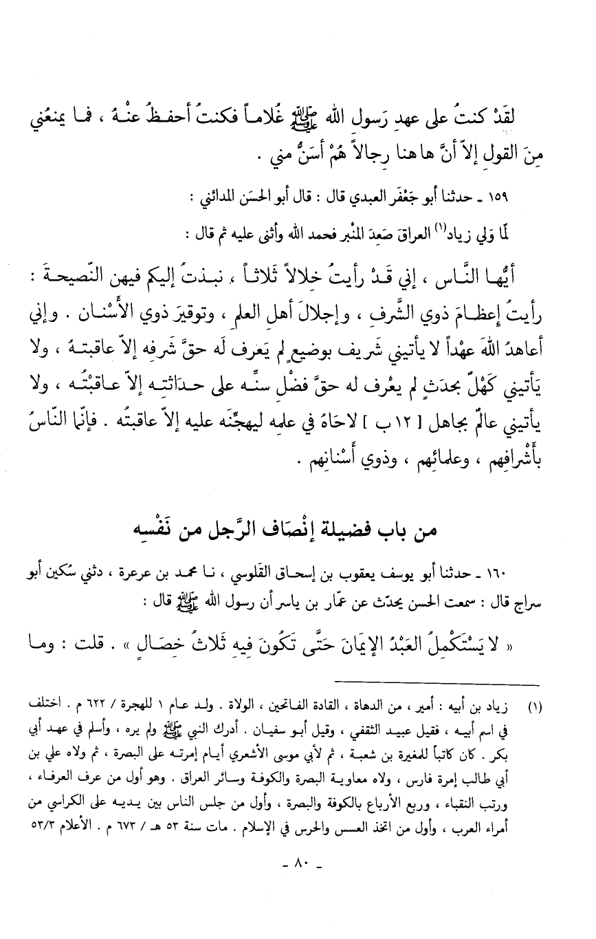أَيُّهَا النَّاسُ إِنِّي قَدْ رَأَيْتُ خِلَالًا ثَلَاثًا نَبَذْتُ إِلَيْكُمْ فِيهِنَّ النَّصِيحَةَ رَأَيْتُ إِعْظَامَ ذَوِي الشَّرَفِ وَإِجْلَالَ أَهْلِ الْعِلْمِ وَتَوْقِيرَ ذَوِي الْأَسْنَانِ