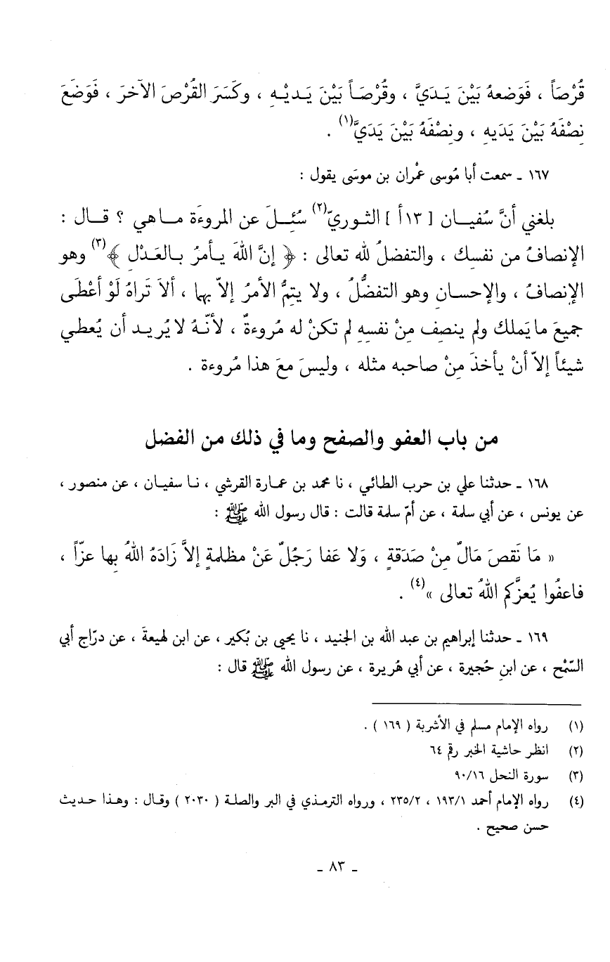 بَلَغَنِي أَنَّ سُفْيَانَ الثَّوْرِيَّ سُئِلَ عَنِ الْمُرُوءَةِ مَا هِيَ قَالَ الْإِنْصَافُ مِنْ نَفْسِكَ وَالتَّفَضُّلُ لِلَّهِ تَعَالَى {إِنَّ اللَّهَ يَأْمُرُ بِالْعَدْلِ} وَهُوَ الْإِنْصَاف وَالْإِحْسَان وَهُوَ التَّفَضُّلُ وَلَا يَتِمُّ الْأَمْرُ إِلَّا بِهِمَا أَلَا تَرَاهُ لَوْ أَعْطَى جَمِيعَ مَا يَمْلِكُ وَلَمْ يُنْصِفْ مِنْ نَفْسِهِ لَمْ تَكُنْ لَهُ مُرُوءَةٌ لِأَنَّهُ لَا يُرِيدُ أَنْ يُعْطِيَ شَيْئًا إِلَّا أَنْ يَأْخُذَ مِنْ صَاحِبِهِ مِثْلَهُ وَلَيْسَ مَعَ هَذَا مُرُوءَة
