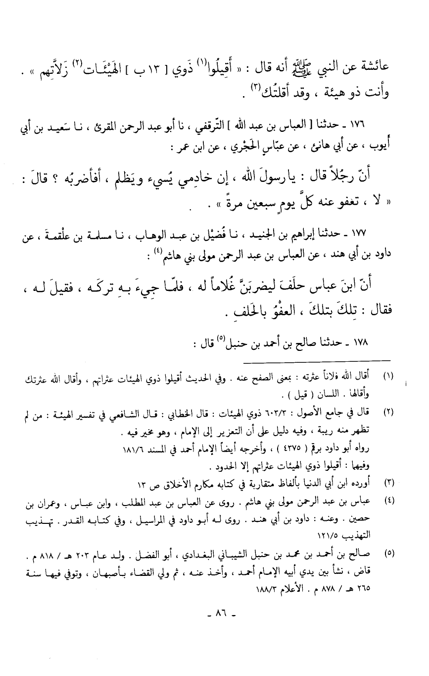 عَائِشَةَ عَنِ النَّبِيِّ صَلَّى اللَّهُ عَلَيْهِ وَسَلَّمَ أَنَّهُ قَالَ أَقِيلُوا ذَوِي الْهَيْئَاتِ زَلَّاتِهِمْ