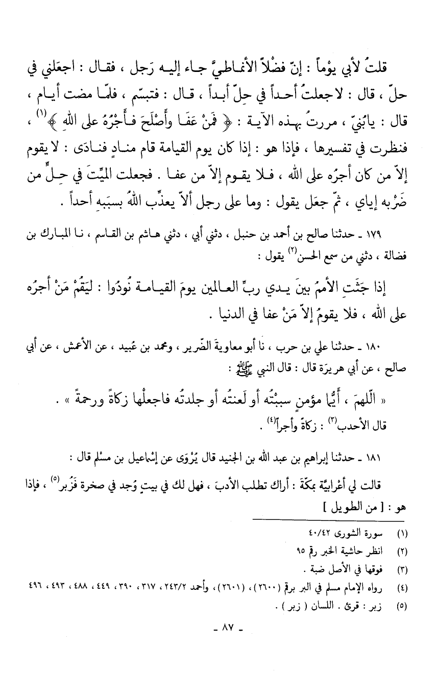 179 - حَدثنَا صَالح بن أَحْمد بن حَنْبَل دثني أبي دثني هَاشم بن الْقَاسِم نَا الْمُبَارك بن فضَالة دثني مَنْ سَمِعَ الْحَسَنَ يَقُولُ