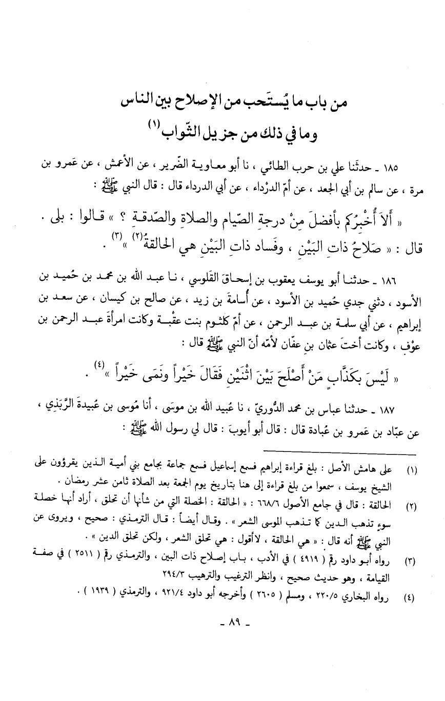 من بَابُ مَا يُسْتَحَبُّ مِنَ الْإِصْلَاحِ بَيْنَ النَّاسِ وَمَا فِي ذَلِكَ مِنْ جَزِيلِ الثَّوَابِ