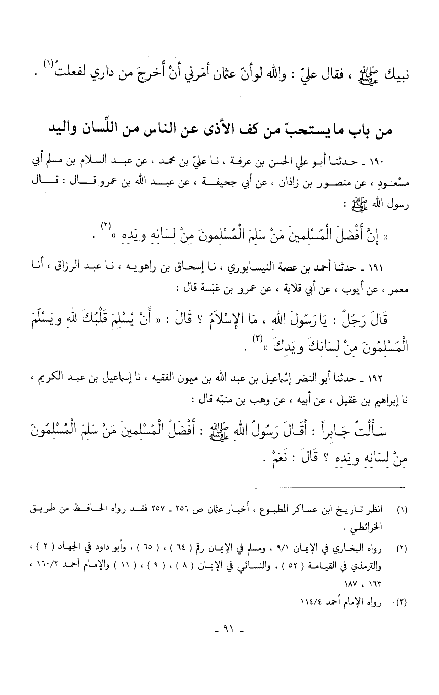 إِنَّ أَفْضَلَ الْمُسْلِمِينَ مَنْ سَلِمَ الْمُسْلِمُونَ مِنْ لِسَانِهِ وَيَدِهِ