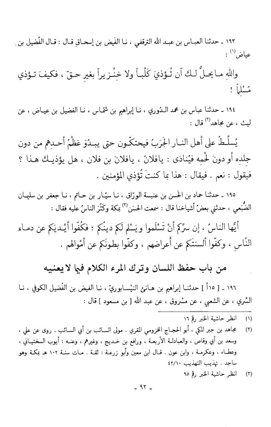 193 - حَدثنَا الْعَبَّاس بن عبد الله الترقفي نَا الْفَيْضُ بْنُ إِسْحَاقَ قَالَ قَالَ الْفُضَيْلُ بْنُ عِيَاضٍ