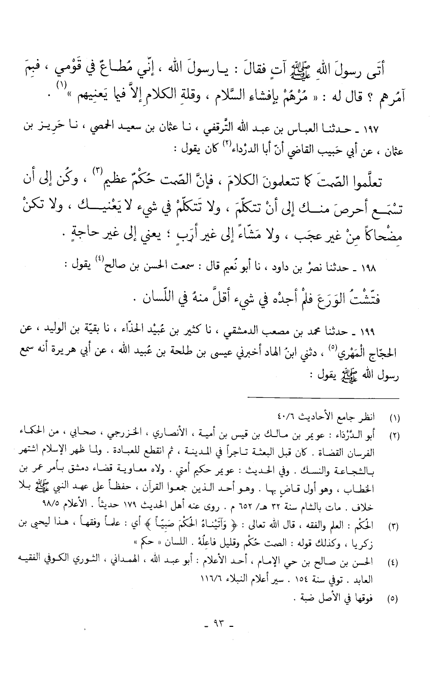 تَعَلَّمُوا الصَّمْتَ كَمَا تَتَعَلَّمُونَ الْكَلَامَ فَإِنَّ الصَّمْتَ حُكْمٌ عَظِيمٌ وَكُنْ إِلَى أَنْ تَسْمَعَ أَحْرَصَ مِنْكَ إِلَى أَنْ تَتَكَلَّمَ وَلَا تَتَكَلَّمْ فِي شَيْءٍ لَا يَعْنِيكَ وَلَا تَكُنْ مِضْحَاكًا مِنْ غَيْرِ عَجَبٍ وَلَا مَشَّاءً إِلَى غَيْرِ أَرَبٍ يَعْنِي إِلَى غير حَاجَة