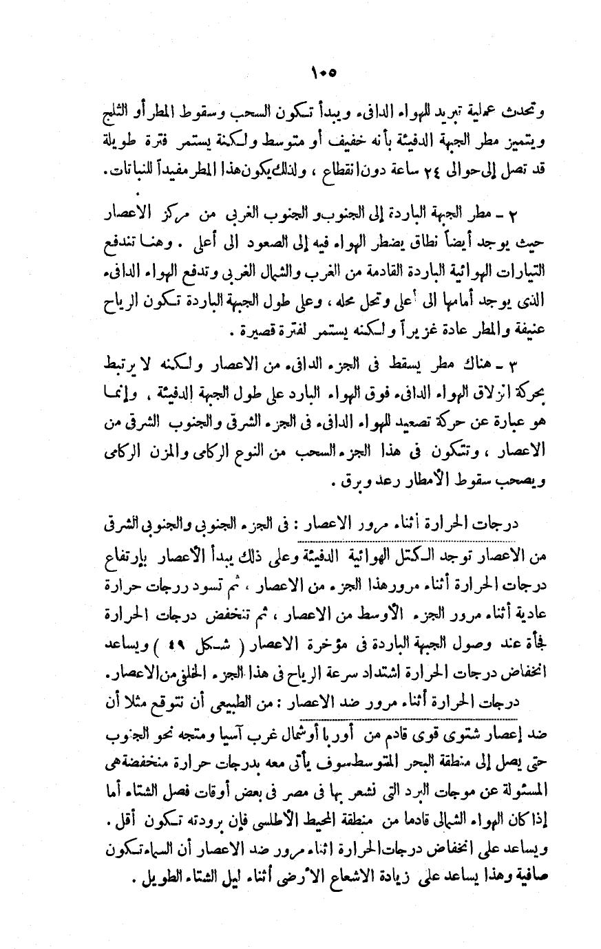 في الجزء الجنوبي والجنوبي الشرقي من الإعصار توجد الكتل الهوائية الدفيئة وعلى ذلك يبدأ الإعصار بارتفاع درجات الحرارة أثناء مرور هذا الجزء من الإعصار، ثم تسود درجات حرارة عادية أثناء مرور الجزء الأوسط من الإعصار، ثم تنخفض درجات الحرارة فجأة عند وصول الجبهة الباردة في مؤخرة الإعصار "شكل 49" ويساعد انخفاض درجات الحرارة اشتداد سرعة الرياح في هذا الجزء الخلفي من الإعصار.