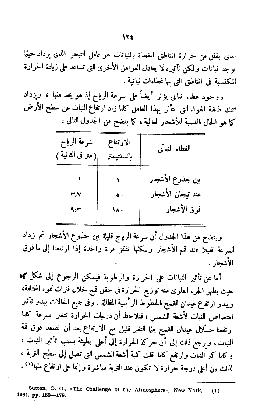 ويتضح من هذا الجدول أن سرعة الرياح قليلة بين جذوع الأشجار، ثم تزداد السرعة قليلًا عند قمم الأشجار، ولكنها تقفز مرة واحدة إذا ارتفعنا إلى ما فوق الأشجار.