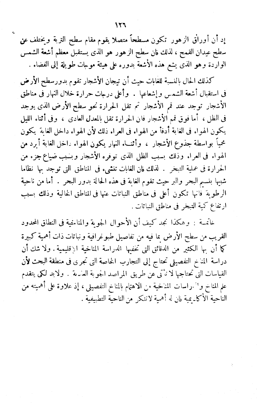 خاتمة: وهكذا نجد كيف أن الأحوال الجوية والمناخية في النطاق المحدود القريب من سطح الأرض بما فيه من تفاصيل طبوغرافية ونباتات ذات أهمية كبيرة كما أن بها الكثير من الدقائق التي تخفيها الدراسة المناخية الإقليمية. ولا شك أن دراسة المناخ التفصيلي تحتاج إلى التجارب الخاصة التي تجرى في منطقة البحث لأن القياسات التي تحتاجها لا تأتي عن طريق المراصد الجوية العادية. ولا بد لكي يتقدم علم المناخ والدراسات المناخية من الاهتمام بالمناخ التفصيلي، إذ علاوة على أهميته من الناحية الأكاديمية فإن له أهمية لا تنكر من الناحية التطبيقية.