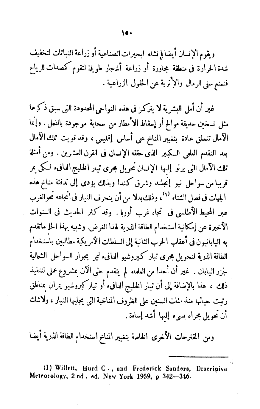 غير أن أمل البشرية لا يتركز في هذه النواحي المحدودة التي سبق ذكرها مثل تسخين حديقة موالح أو إسقاط الأمطار من سحابة موجودة بالفعل. وإنما الآمال تتعلق عادة بتغيير المناخ على أساس إقليمي، وقد قويت تلك الآمال بعد التقدم العلمي الكبير الذي حققه الإنسان في القرن العشرين. ومن أمثلة تلك الآمال التي يرنو إليها الإنسان تحويل مجرى تيار الخليج الدافئ لكي يمر قريبًا من سواحل نيو إنجلند وشرق كندا وبذلك يؤدي إلى تدفئة مناخ هذه الجهات في فصل الشتاء1، وذلك بدلًا من أن ينحرف التيار في اتجاهه نحو الغرب عبر المحيط الأطلسي في تجاه غرب أوربا. وقد كثر الحديث في السنوات الأخيرة عن إمكانية استخدام الطاقة الذرية لهذا الغرض. وشبيه بهذا الحلم ما تقدم به اليابانيون في أعقاب الحرب الثانية إلى السلطات الأمريكية مطالبين باستخدام الطاقة الذرية لتحويل مجرى تيار كيروشيو الدافئ ليمر بجوار السواحل الشمالية لجزر اليابان. غير أن أحدًا من العلماء لم يتقدم حتى الآن بمشروع عملي لتنفيذ ذلك، هذا بالإضافة إلى أن تيار الخليج الدافئ أو تيار كيروشيو يمران بمناطق رتبت حياتها منذ مئات السنين على الظروف المناخية التي يجلبها التيار، ولا شك أن تحويل مجراه يسيء إليها أشد إساءة.